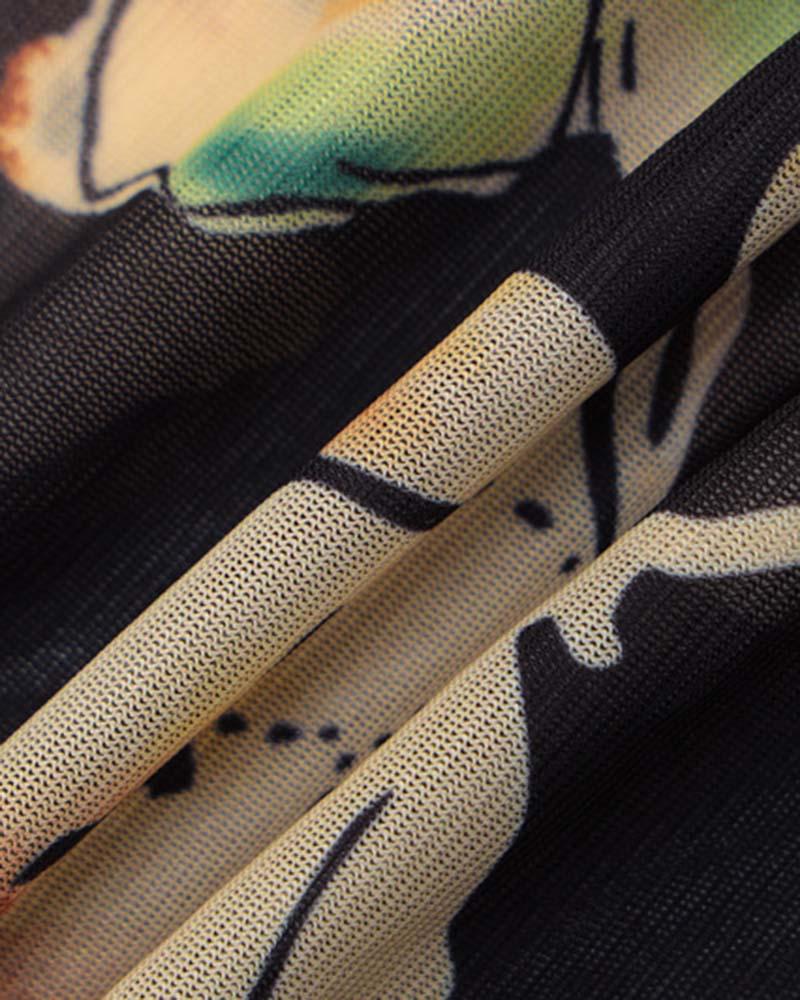 Details: Backless mesh dress with sleeves design and graphical print details