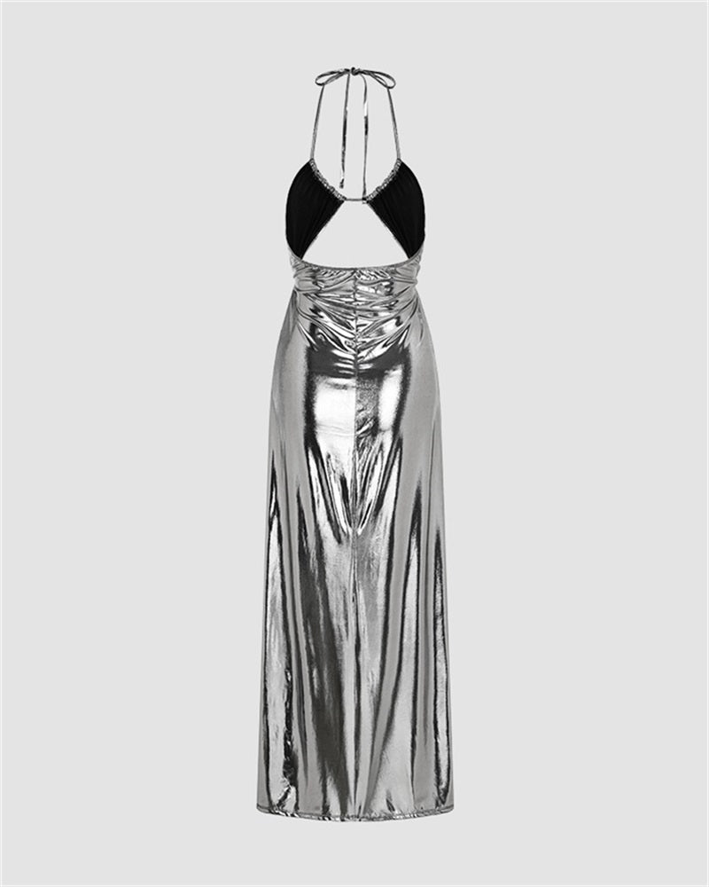 Details: Metallic-style dress with high side slit design and backless details