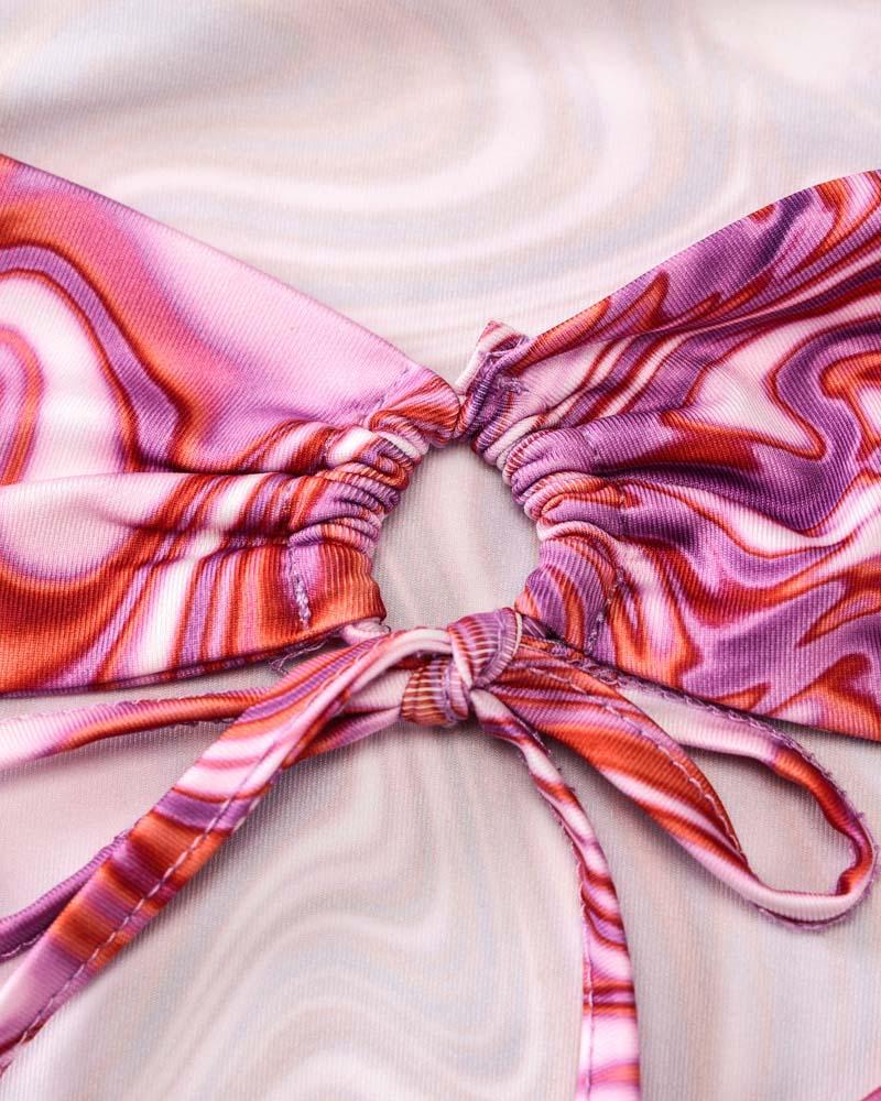 Details: Long halter dress with watermarbled print and front cut-out details