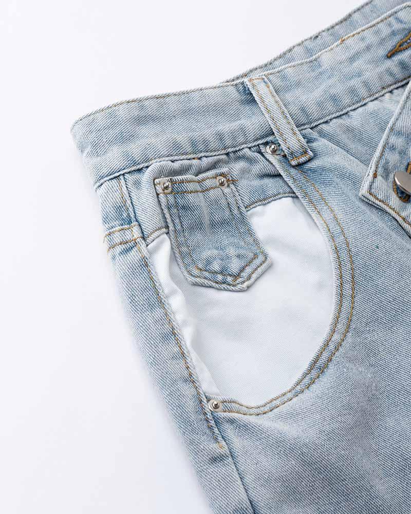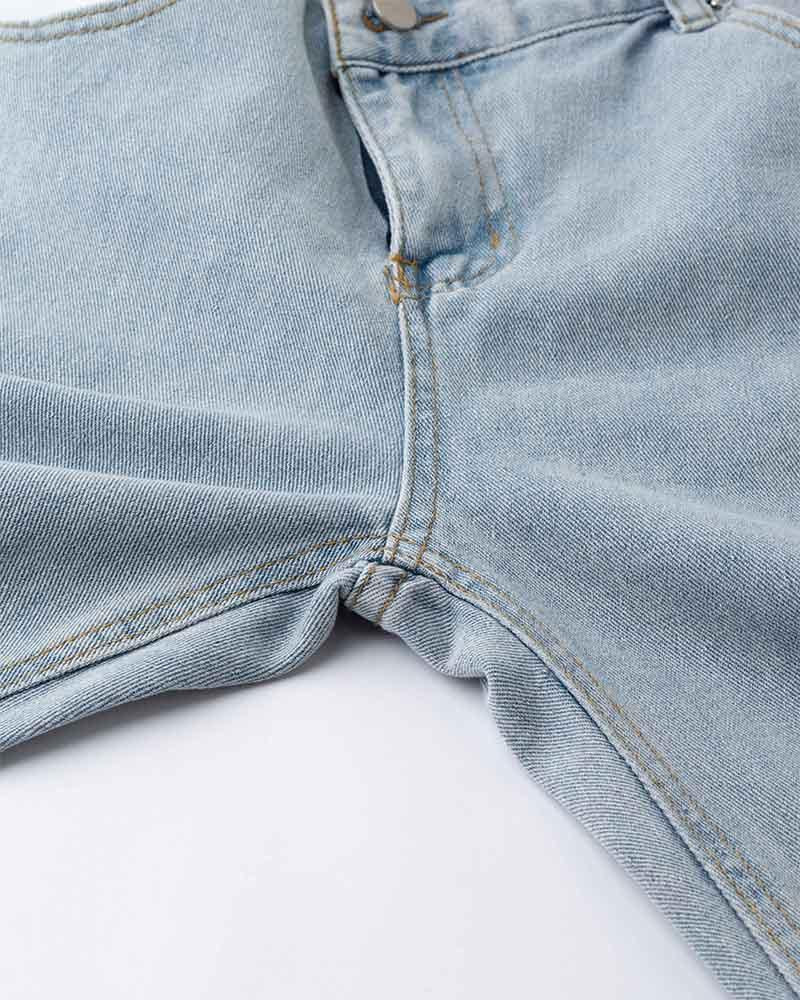 Details: Long denim jeans with unique asymmetical design