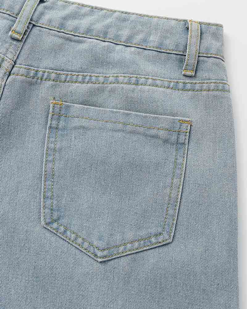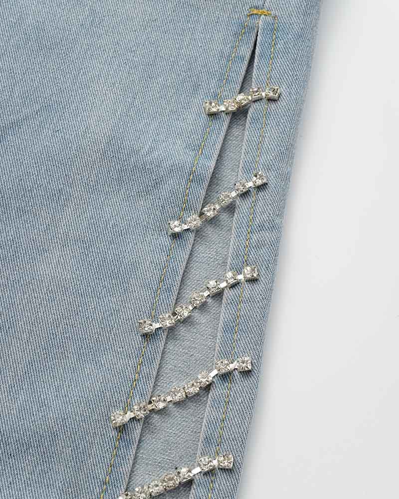 Details: Denim skirt with side slit metal chain design