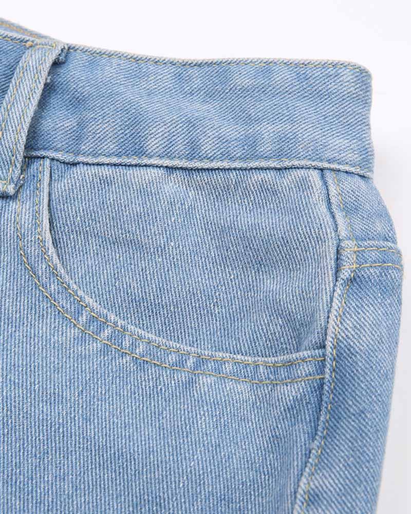 Details: Duo-color denim pants with rip-off design