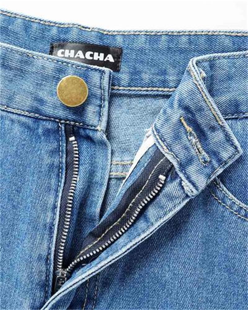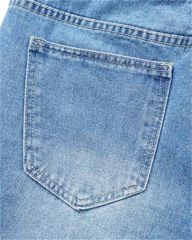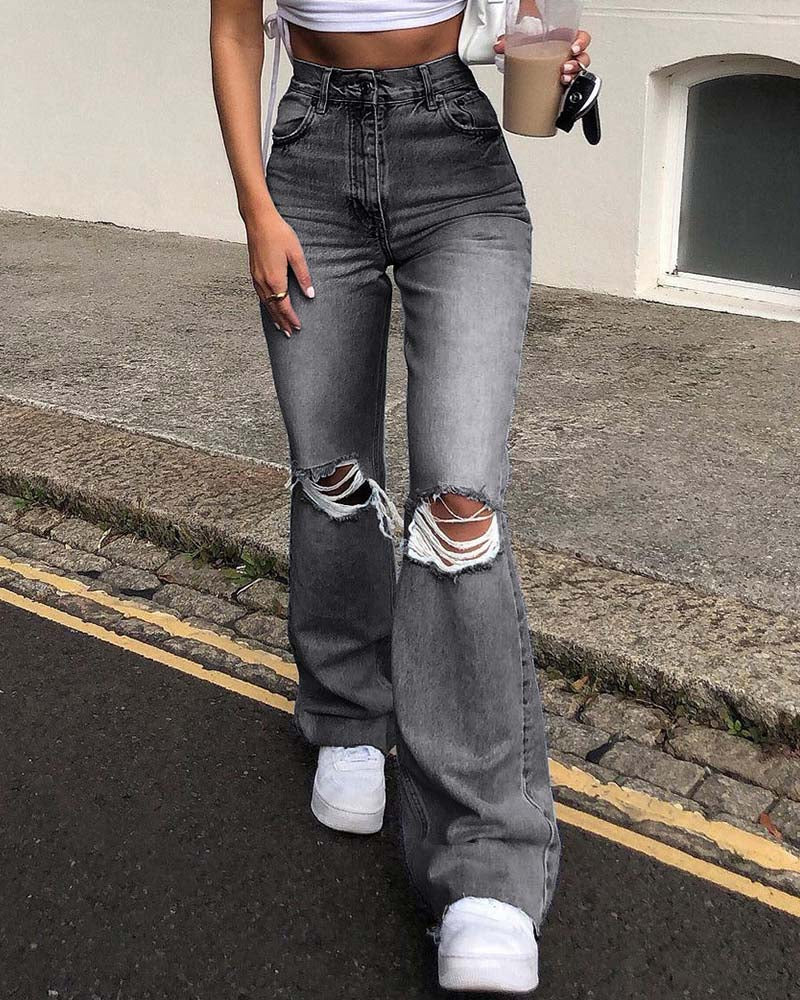 Details: Long denim jeans with rip-off knee design