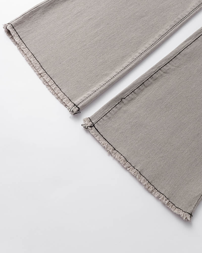Details: Long denim trousers with back stars design and flare details