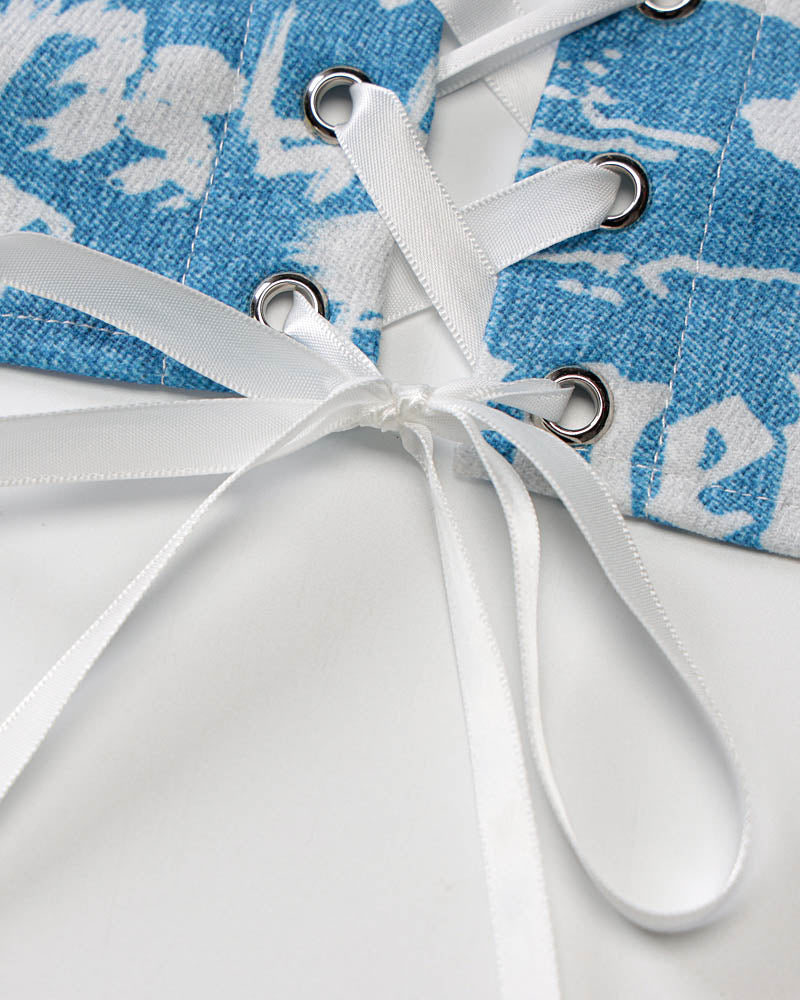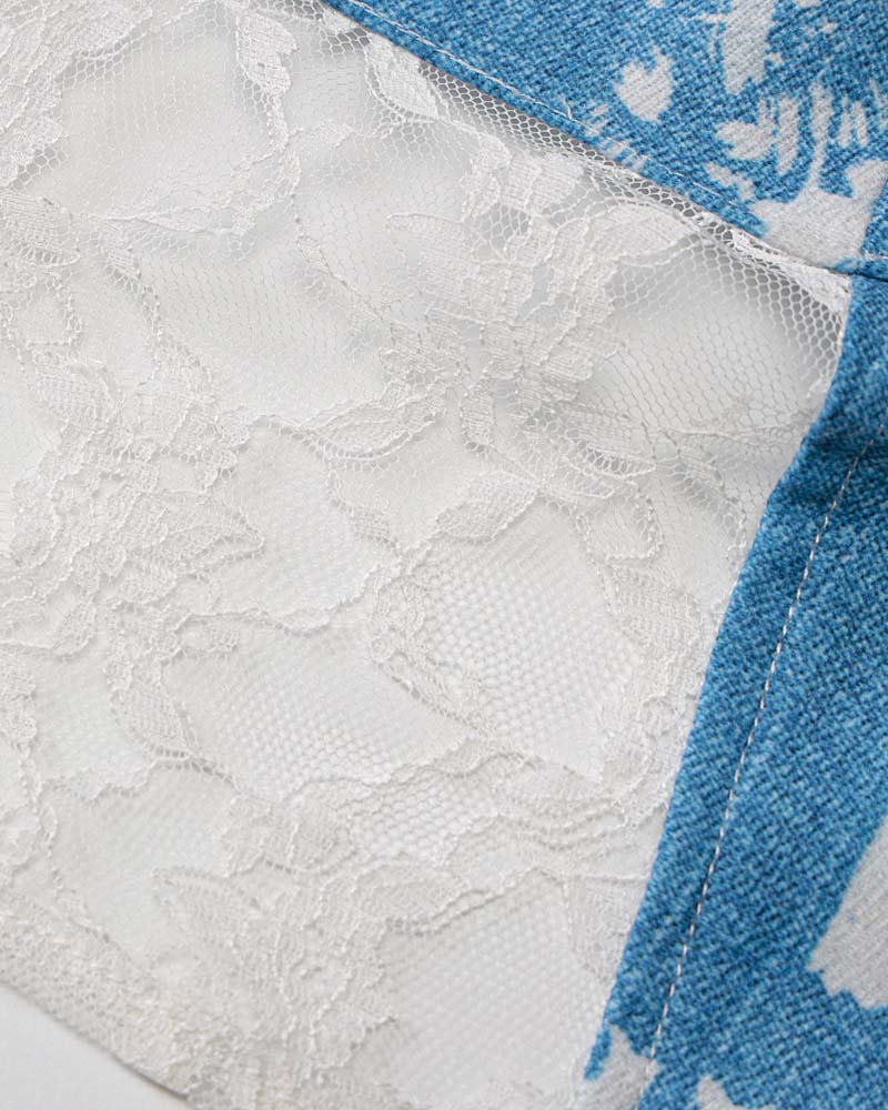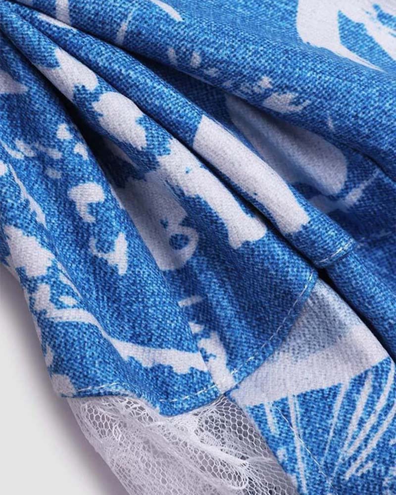 Details: Blue halter top with abstract floral print and lace waist design