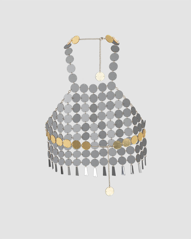Details: Halter top composed of glimmering golden coins