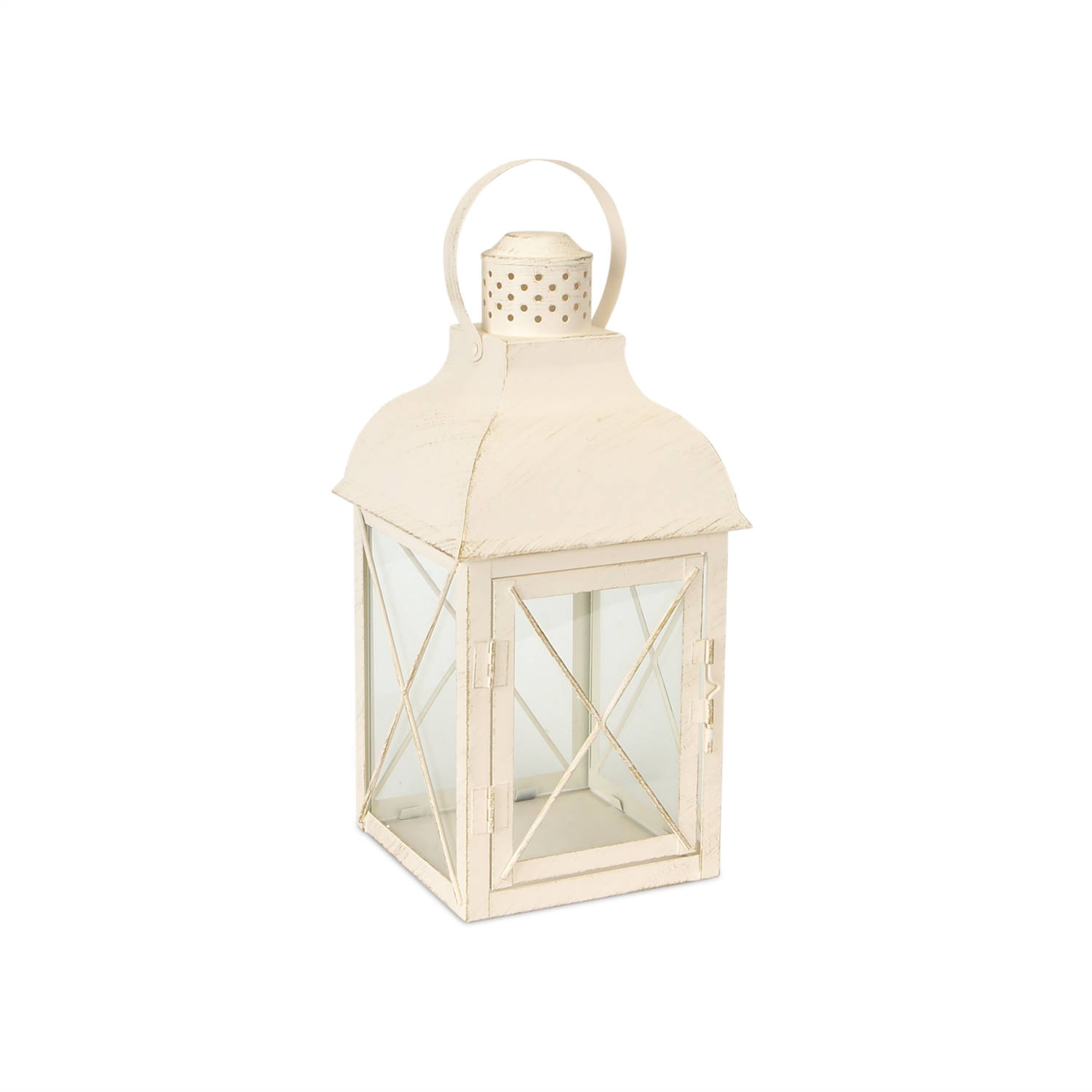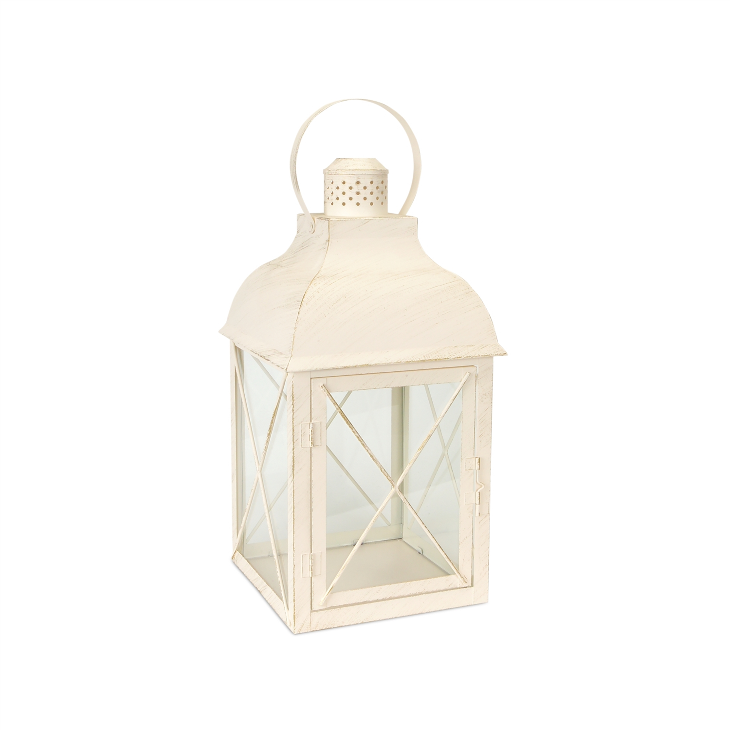 Elevate your home decor with this stunning set of rustic white lanterns. With a traditional design and weathered ivory finish, these lanterns bring timeless charm to any space. Crafted from durable metal and glass, they are designed to withstand the elements, making them perfect for both indoor and outdoor settings. Add real wax or LED candles (sold separately) to create a cozy ambiance, or get creative by incorporating faux florals for a personalized touch. Whether displayed as a centerpiece or placed around your home, these lanterns offer a versatile and charming addition to any decor style. Sold in a set of three assorted sizes to create a balanced display in your home.