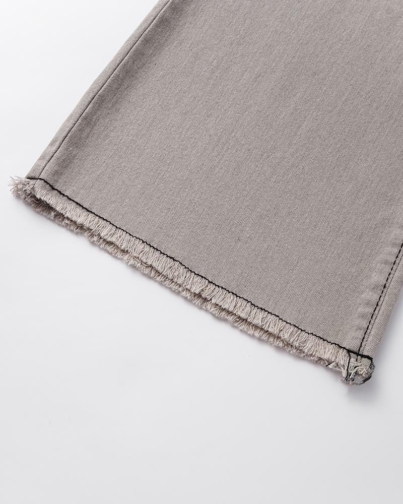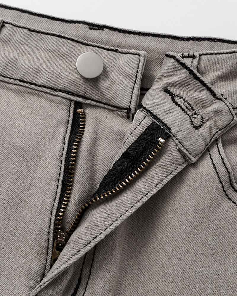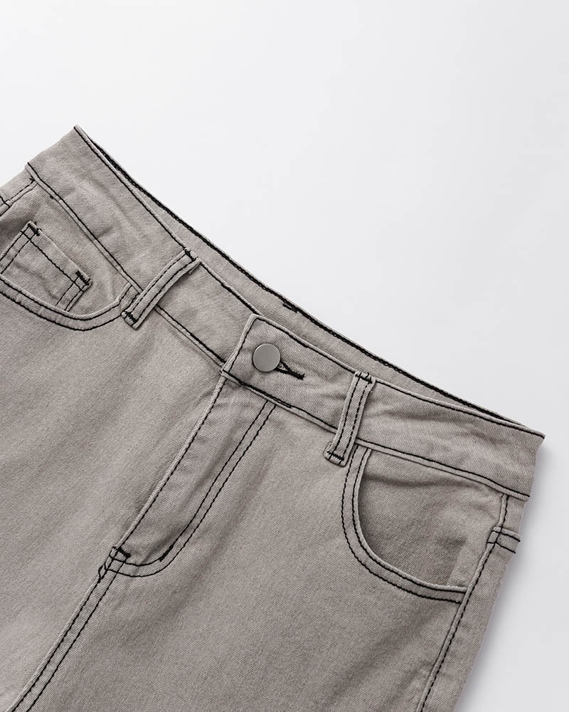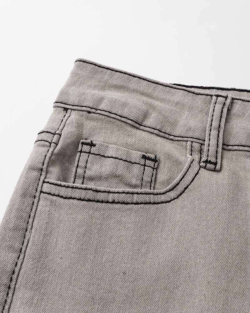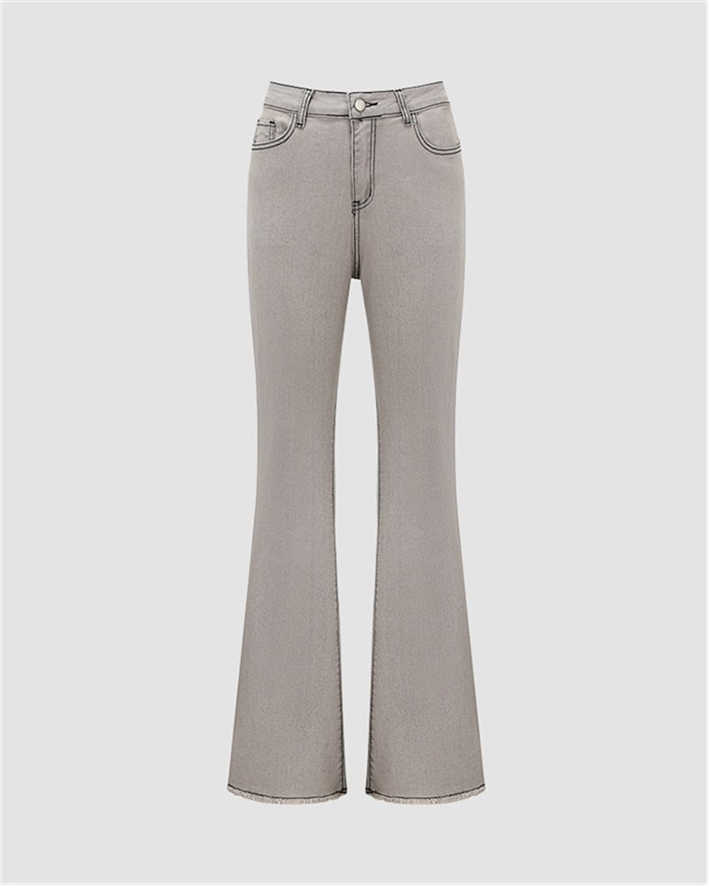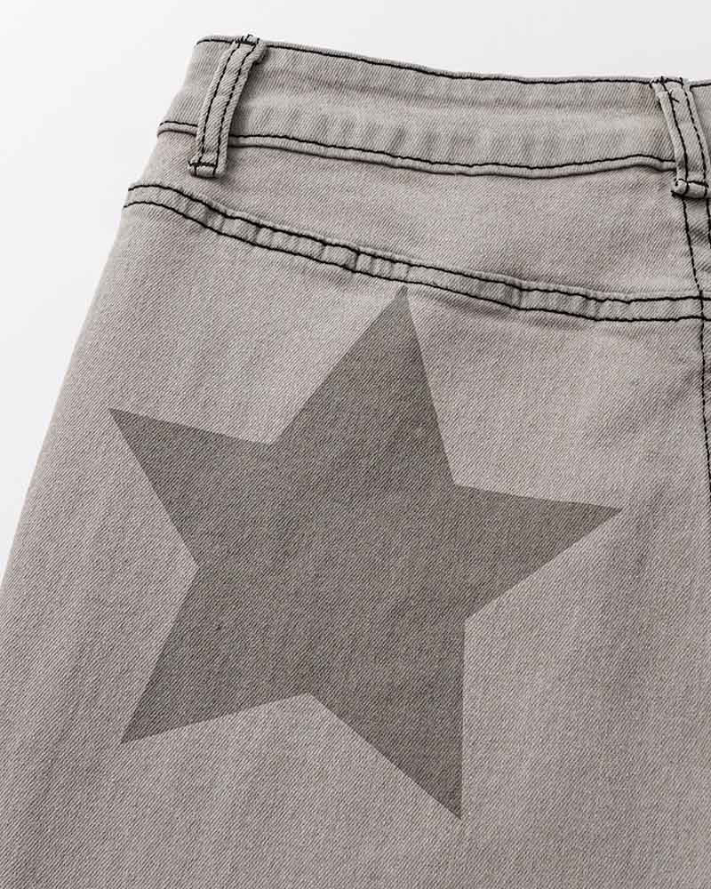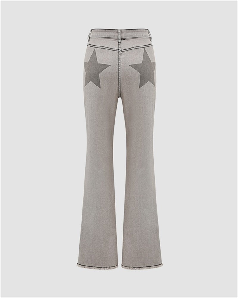 Details: Long denim trousers with back stars design and flare details